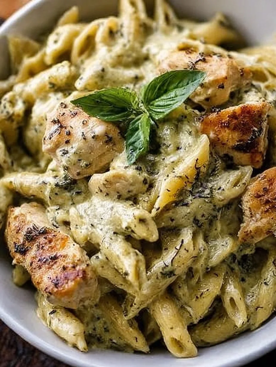 Basic items—pasta, chicken, pesto, and cheese—make a bowl that tastes restaurant-good. Each bite is creamy, herby, and satisfying without being heavy.