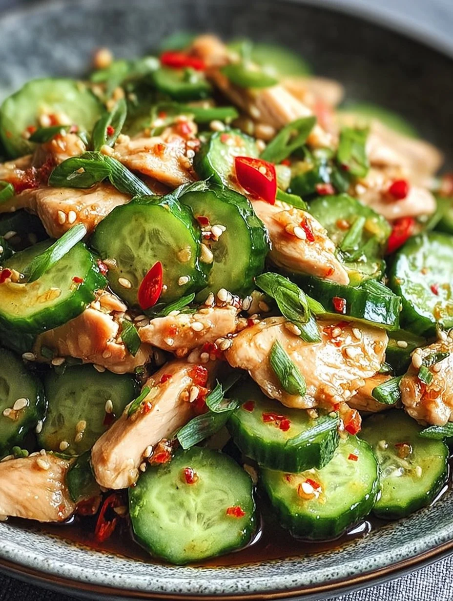 A bright, crunchy salad featuring cucumbers, chicken, and a zesty Thai dressing, perfect for warm days.